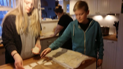Fanney hnoðar, fletur úr og sker og Katrín og Gísli leggja hönd á plóg. Svo þarf að steikja brauðið, pakka því og koma því í frysti.